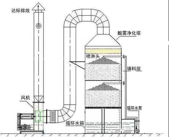 工作原理:廢氣凈化噴淋塔主要的運(yùn)作方式是廢氣由風(fēng)管引入凈化塔,經(jīng)過(guò)填料層,廢氣與氫氧化鈉吸收液進(jìn)行氣液兩相充分接觸吸收中和反應(yīng),廢氣經(jīng)過(guò)凈化后,再經(jīng)除霧板脫水除霧后由風(fēng)機(jī)排入大氣。吸收液在塔底經(jīng)水泵增壓后在塔頂噴淋而下,然后回流至塔底循環(huán)使用。凈化后的廢氣達(dá)到地方排放標(biāo)準(zhǔn)的排放要求,低于國(guó)家排放標(biāo)準(zhǔn)。